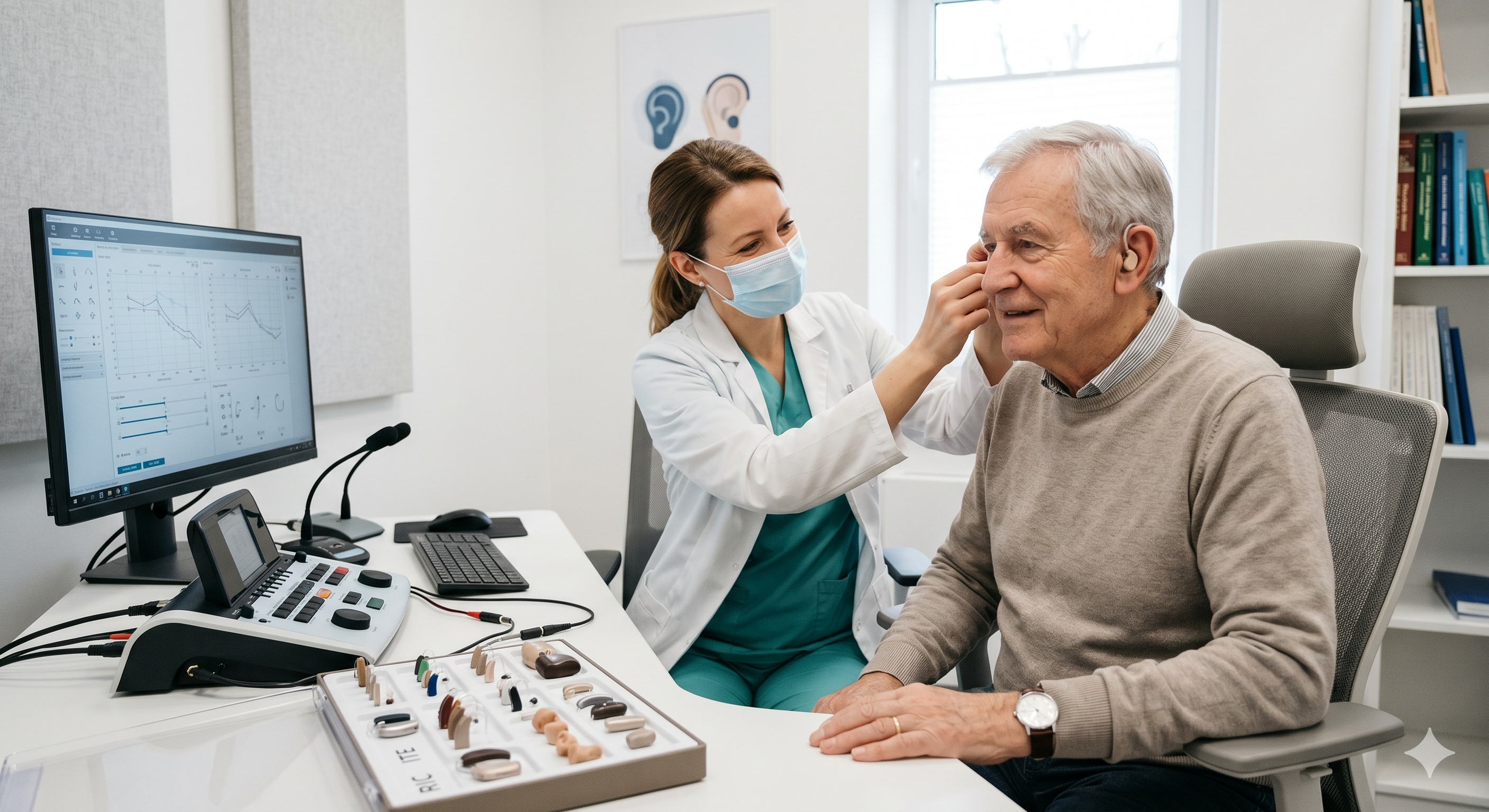 Proceso profesional de selección y ajuste de aparatos auditivos de alta tecnología.